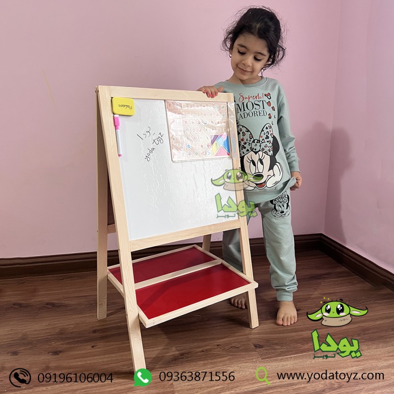 تخته دوطرفه پایه دار چوبی کودک تخته ای است با دو روی متفاوت، یکی سیاه (با قابلیت نوشتن با گچ و نصب حروف منتی) و یکی سفید با قابلیت نوشتن با ماژیک وایت برد و نصب حروف مغناطیسی. که هر سمت این تخته ها طول و عرضی برابر ( 45 در 45 سانتیمتر) دارند و امکان استفاده دو الی چند کودک را بصورت هم زمان از دو طرف تخته می دهد .