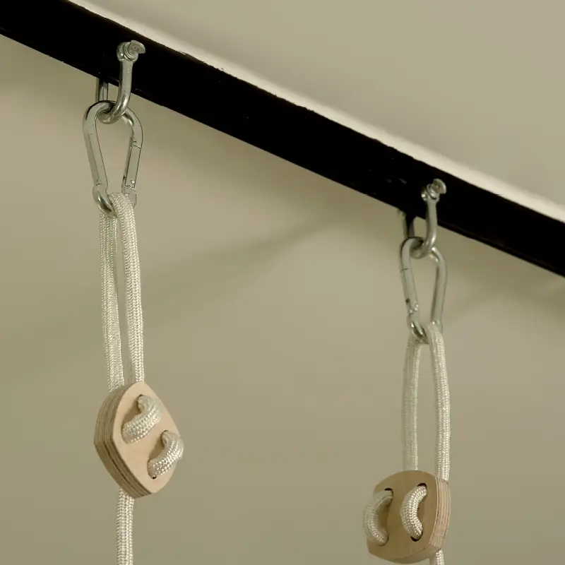 دارای دوعدد کارابین کوهنوردی برای اتصال به حلقه سقف یا نردبان سوئدی