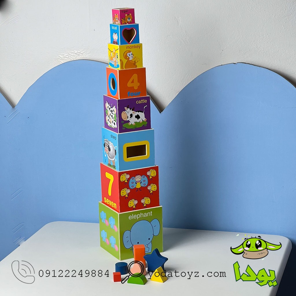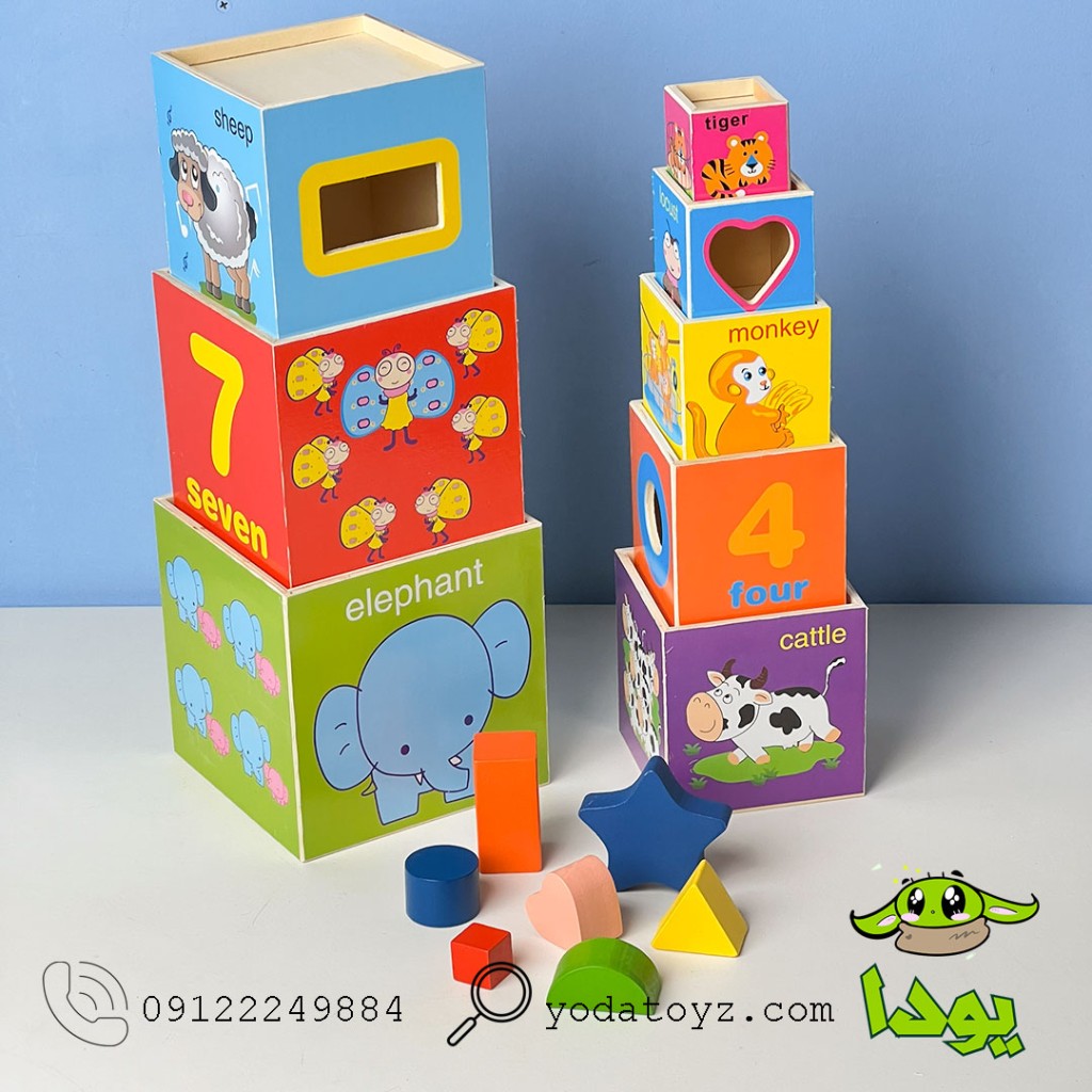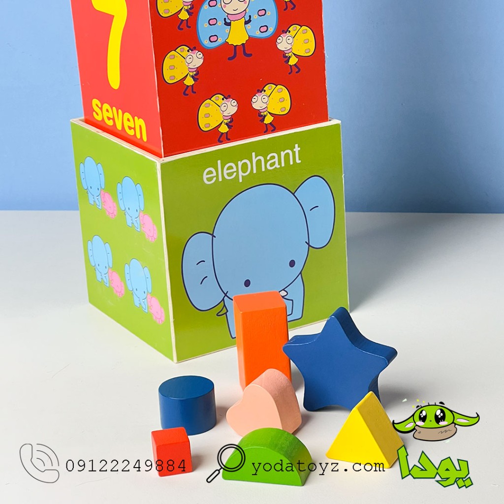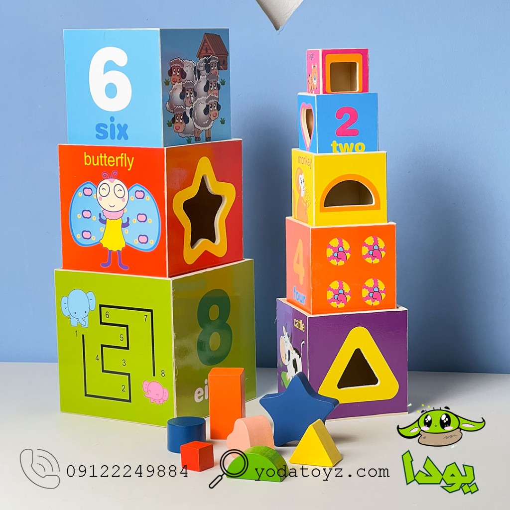 شامل 8 مکعب چوبی رنگارنگ با سایز های مختلف و تصاویر جذاب